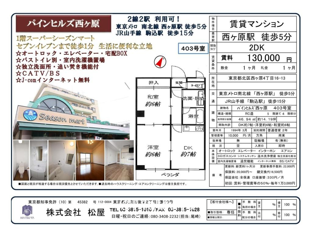 | 主要アクセス | 東京メトロ南北線 西ヶ原駅 から 徒歩5分 | 専有面積 | 46.94m 2 ( 14.19坪 ) | ||