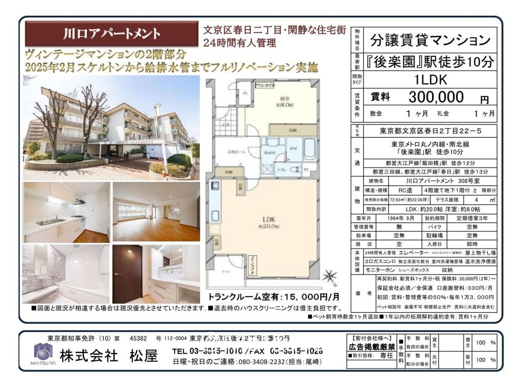 | 主要アクセス | 東京メトロ南北線 後楽園駅 から 徒歩10分 | 専有面積 | 72.93m 2 ( 22.06坪 ) | ||